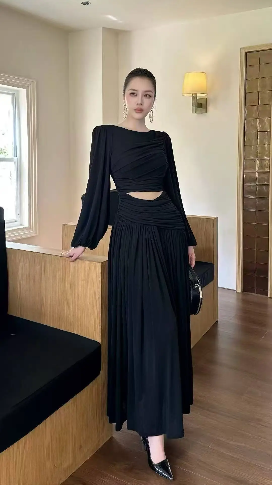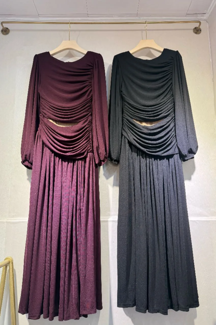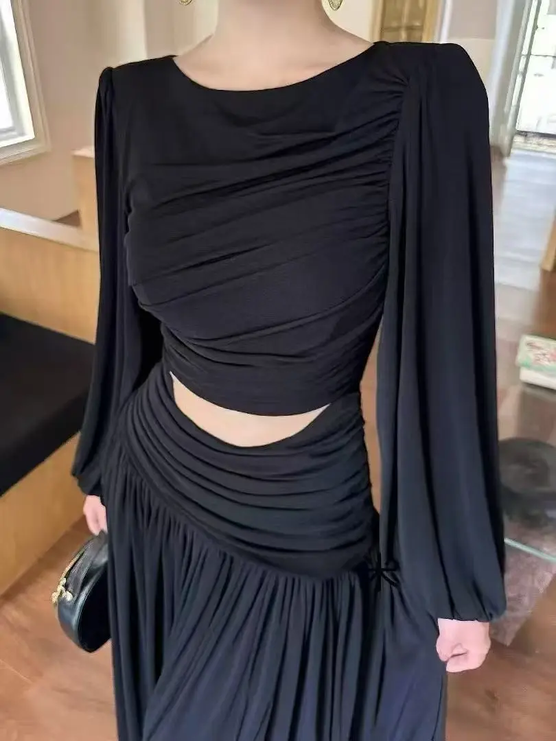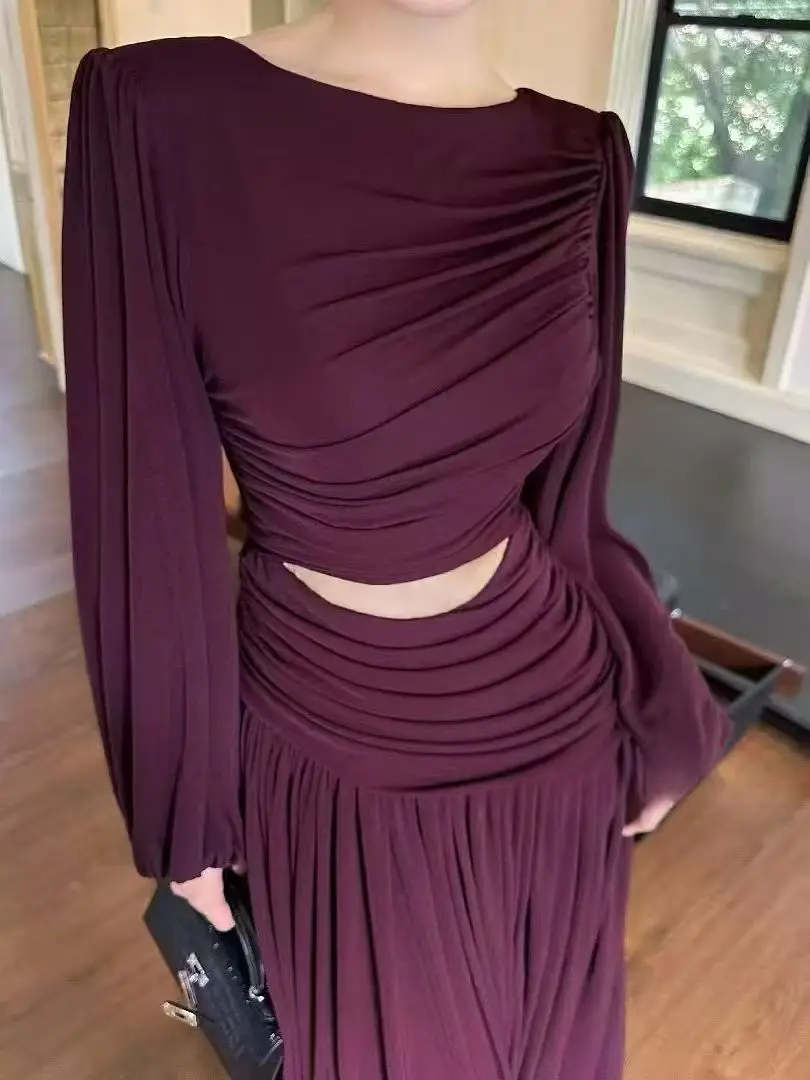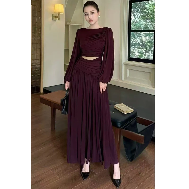 AELESEEN Autumn Winter 2026 New French Solid Color Long Dress Hand Woven O-Neck Slim Pullover Dress Waist Hollow Out Party